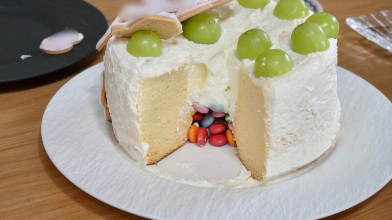 シフォンケーキの穴の中にマーブルチョコレートを入れて、生クリームをしっかり目に泡立てて、アイシングクッキーはシャインマスカットを土台に飾りました。
